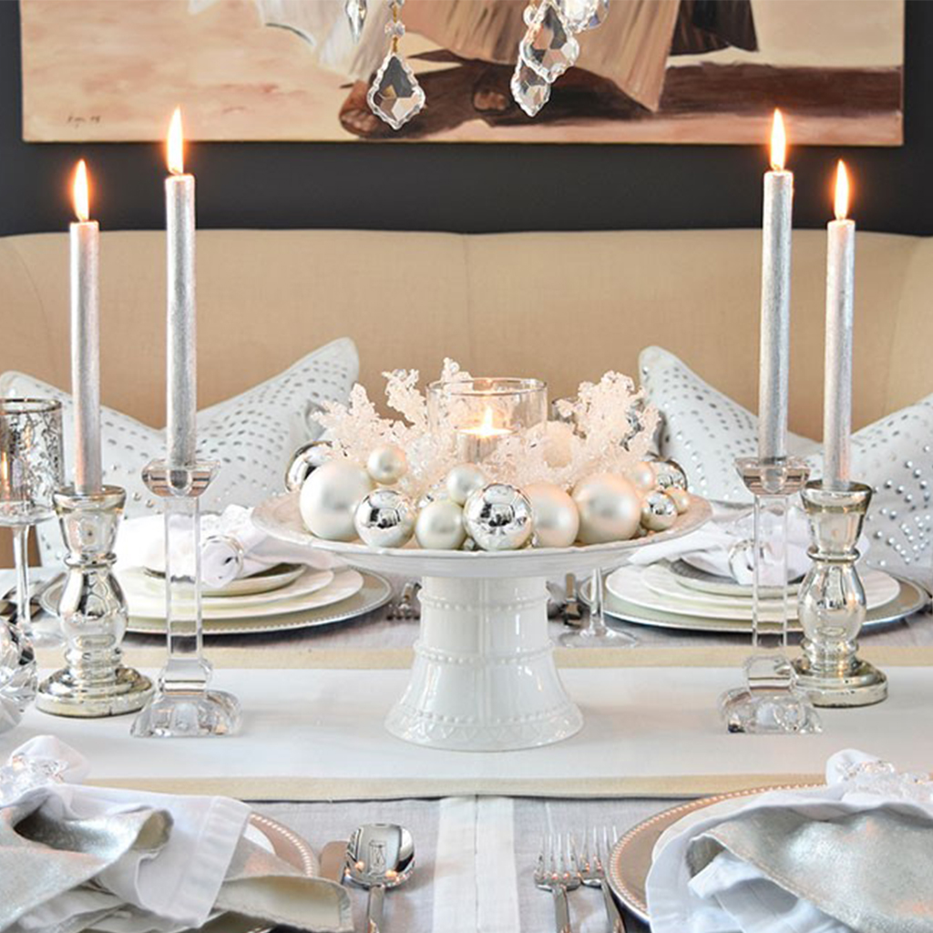 Create a centrepiece that will be the focal point of your tablescape. It can be either a vase with flowers and greenery or an assortment of Christmas balls in a bowl.